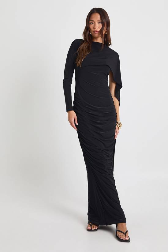 Make a captivating entrance in this show-stopping slinky maxi dress. The innovative cape-style sleeve creates drama and movement whilst the ruched detailing sculpts your silhouette to perfection. The crew neckline keeps the look sophisticated, whilst the open back design introduces an element of surprise when you turn around. Style with strappy heels and statement gold jewellery as seen on our model for a night out in the city. This versatile piece transitions effortlessly from cocktail parties to club nights, making it an essential addition to your going-out wardrobe. The form-fitting design and floor-length hem create a sleek, elongated silhouette that commands attention wherever the night takes you.